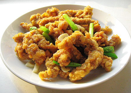 3、炸好的排条可以直接蘸椒盐食用,用葱蒜拌炒一下香味更佳。