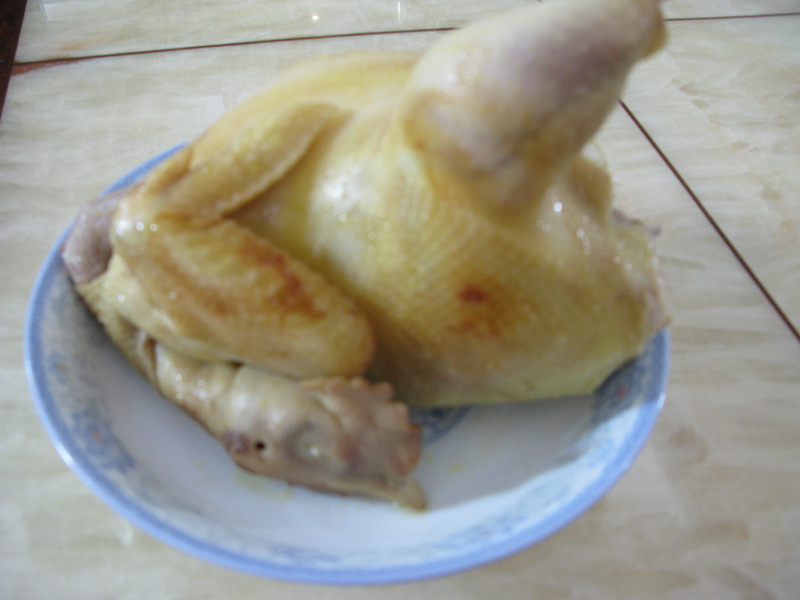 最好是用750-900克的放养鸡,老抽不要放太多,只是用来调颜色的,生老抽汁要把整个鸡皮都涂均匀啊!鸡腔内放2棵葱。