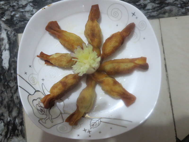 及以下步骤:用手压一下尾巴 把两边卷起,按平 依次包好 放入平底锅,用油煎 四面煎透即可 用手压一下尾巴 把两边卷起,按平 依次包好 放入平底锅,用油煎 四面煎透即可