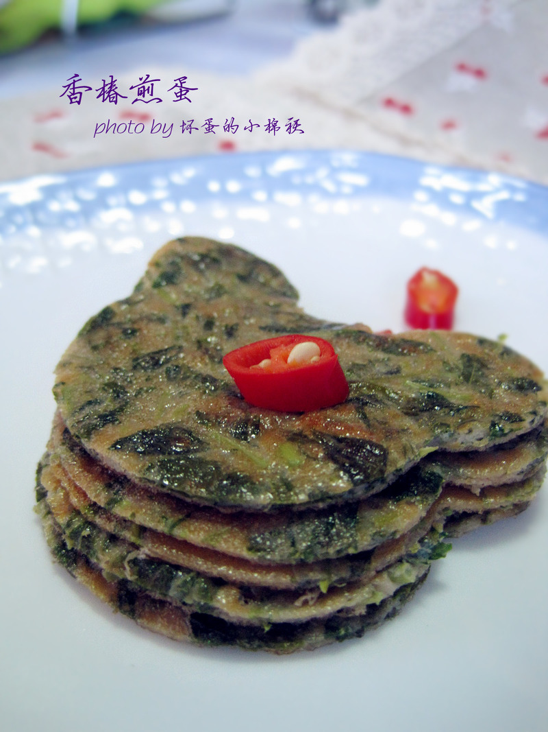 及以下步骤:平底锅刷上薄薄的油 香椿液倒入锅中,晃动平底锅,摊成薄薄的一层,小火煎至边缘微微翘起即可。 2元一把的香椿 把老枝去掉,洗净,沥去多余的水份 水煮开后,把香椿叶放入焯一下 焯过的香椿去除多余水份,摊凉后切碎 鸡蛋加少许盐打散 香椿加入鸡蛋中搅均 平底锅刷上薄薄的油 香椿液倒入锅中,晃动平底锅,摊成薄薄的一层,小火煎至边缘微微翘起即可。