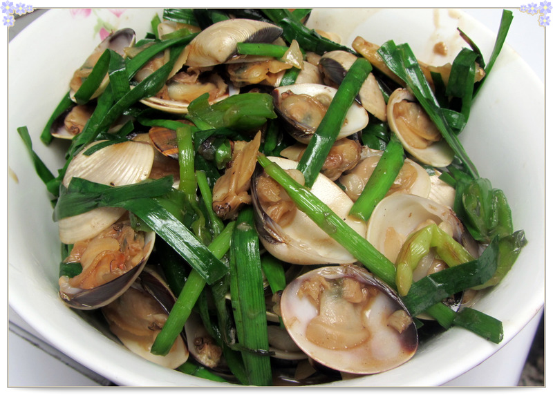 3、开大火下油先把辣椒、蒜蓉、姜片爆香再放白贝爆炒,放黄酒。爆炒干水再放韭菜大蒜段。最后勾芡上碟