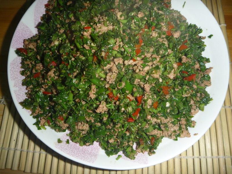 2、把所有材料切碎,肉剁碎