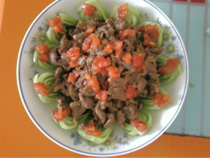 及以下步骤:撒上番茄末,这道色香味俱全的菜就做成了: 牛里脊切丝,用姜、盐、料酒腌着 番茄切成末 牛里脊切丝,用姜、盐、料酒腌着 番茄切成末 京白菜劈成凉拌洗干净,焯水后摆盘 然后放上番茄末(我觉得这个步骤也可以到最后一起加也可以) 热油炒牛肉 炒好的牛肉盛在盘子里: 撒上番茄末,这道色香味俱全的菜就做成了: