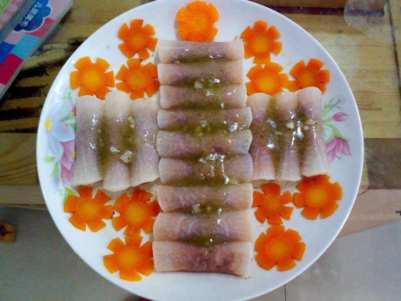 3、萝卜削皮砌片(刀功不到家砌得不够均匀)