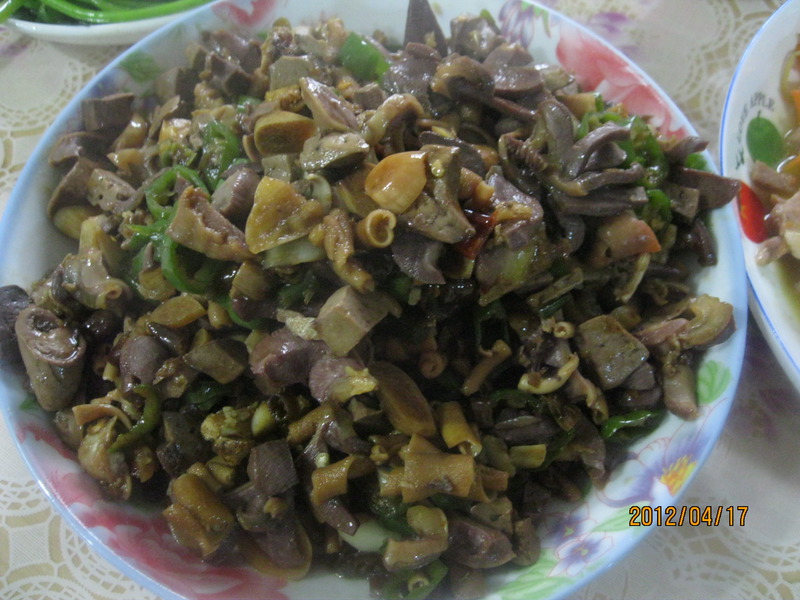 7、鸡杂洗干净,要很干净,肠子要焯水,切碎