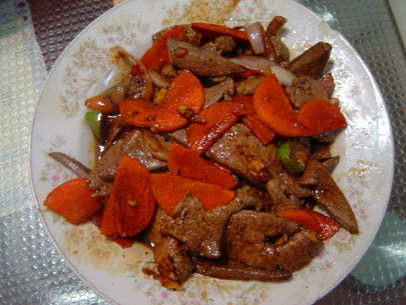 5、起油锅,下猪肝快速翻炒至变色,盛起待用