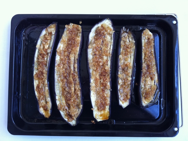 及以下步骤:热锅下油,将蒜蓉炒香。 茄子对半切,中间长线型划下去3刀,以便入味,蒜剁成蓉。 热锅下油,将蒜蓉炒香。 茄子对半切,中间长线型划下去3刀,以便入味,蒜剁成蓉。 热锅下油,将蒜蓉炒香。 茄子对半切,中间长线型划下去3刀,以便入味,蒜剁成蓉。 热锅下油,将蒜蓉炒香。 茄子对半切,中间长线型划下去3刀,以便入味,蒜剁成蓉。 热锅下油,将蒜蓉炒香。 茄子上锅蒸8分钟,然后将炒好的蒜蓉均匀地铺在茄子上,抹一层香油,烤箱200度预热5分钟烤8分钟,再上一层香油加葱花,烤一分钟即可。既香又软,我是连皮一起咬的。