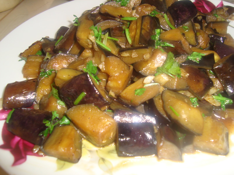 及以下步骤:茄子切块。 蒜、香菜切末。 茄子切块。 蒜、香菜切末。 茄子切块。 蒜、香菜切末。 茄子切块。 锅内油烧热,下蒜末炝锅,放入茄子翻炒。 将老抽、盐、白糖、味精、淀粉加水兑成汁,茄子炒到变色时,烹入汁。 翻炒几下,撒上香菜末即可盛盘。