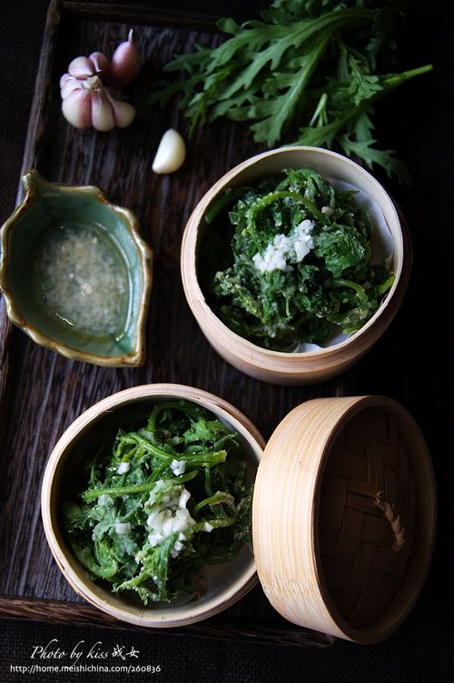 及以下步骤:蒸锅水烧开,摆入蒸笼大火蒸制3-5分钟,关火。 取出,将味汁浇在蒸好的茼蒿上即可 。 茼蒿择洗干净,沥水。 掐断长梗取嫩叶部分。 茼蒿叶摊开沥干水分待用。 适量蒜泥、盐、清水、香油拌匀调成味汁。 面粉与玉米面混合后撒入茼蒿中抓匀。(让每片叶子都均匀沾上米粉) 拌好的茼蒿放入蒸笼中,盖上盖子。 蒸锅水烧开,摆入蒸笼大火蒸制3-5分钟,关火。 取出,将味汁浇在蒸好的茼蒿上即可 。