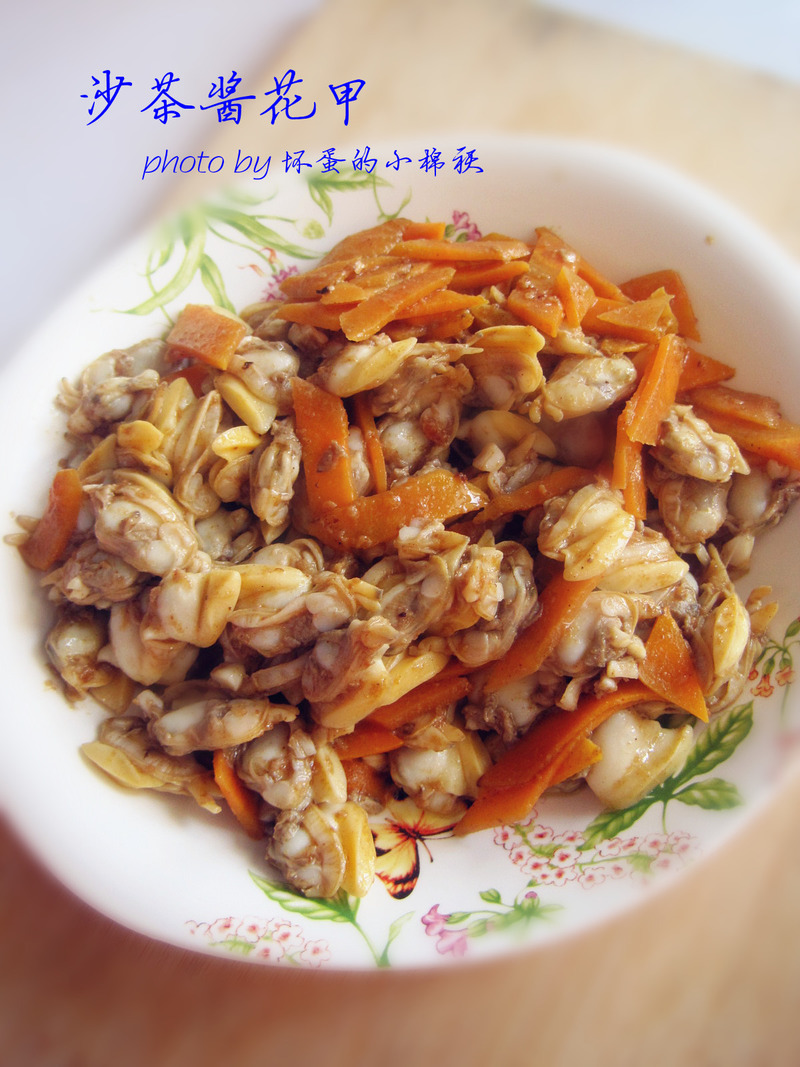及以下步骤:取出肉 花甲灼一下 取出肉 花甲灼一下 取出肉 花甲灼一下 取出肉 胡萝卜切成菱形 油烧热后放入胡萝卜和沙茶酱,炒香 放入花甲,加入适量调料翻炒入味即可