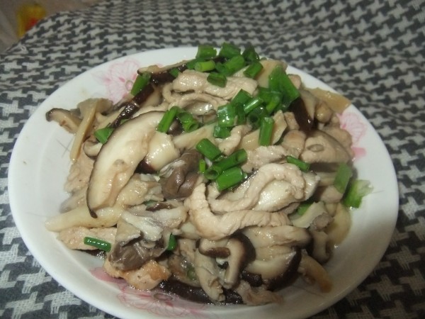 及以下步骤:撒上葱花即可装盘食用 准备好食材 肉洗净切片用料酒、醋、盐腌制10分钟 准备好食材 肉洗净切片用料酒、醋、盐腌制10分钟 鲜香菇洗净去菇蒂切片 凤尾菇洗净用手撕成小瓣 锅内油烧热把腌制好的肉片下锅炒香 待肉炒至变色,倒入双菇翻炒至熟 撒上葱花即可装盘食用