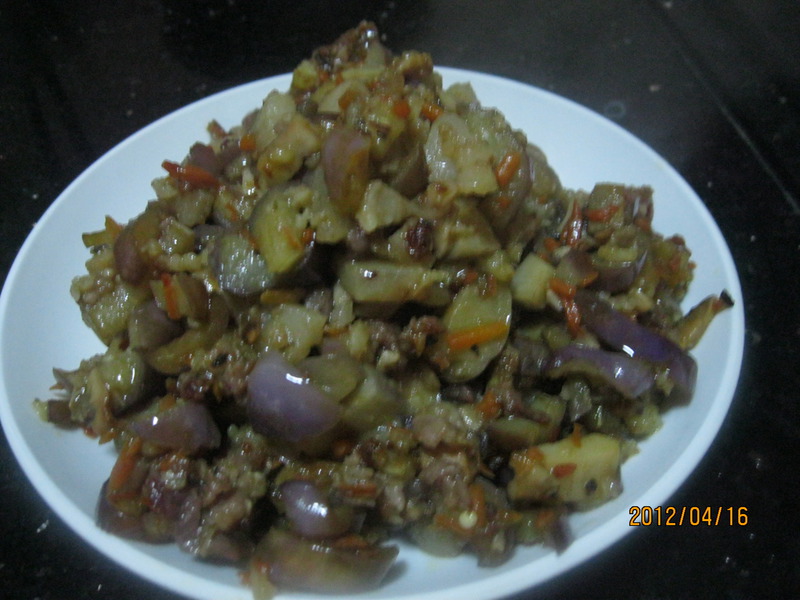 用来做包子的馅剩下一些,茄子有一个,莲藕有些头尾,全部放在一起炒炒,居然很好吃
