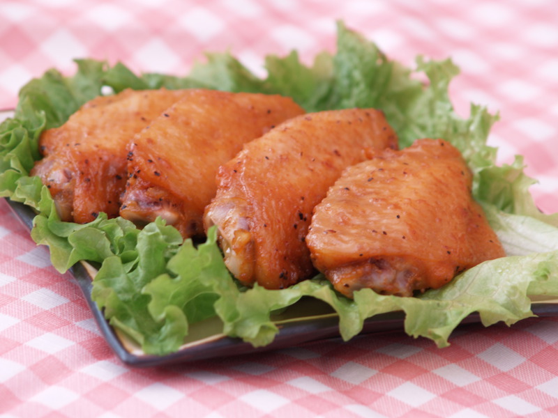 3、将腌制好的翅根用烤箱烤制,用170~180℃加热15分钟左右,烤至八成熟后,再用200℃烤3分钟,这样可以使其表皮颜色焦黄诱人。也可用微波炉烧烤功能烤制,时间控制在10分钟左右