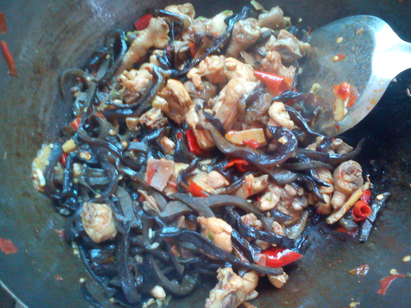 4、看着鸡肉超不多都起卷了...就放木耳下去翻炒...先炒一下...注意第二次放盐哦。