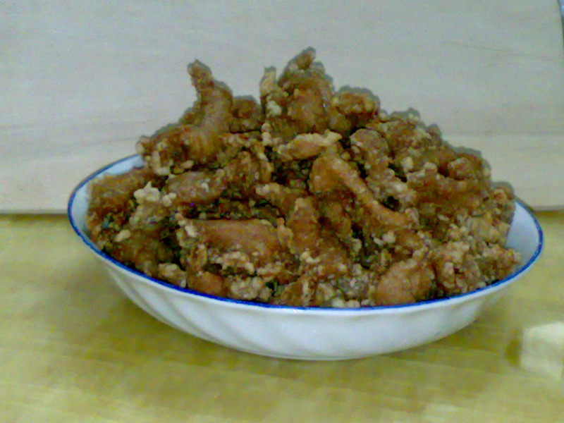 3.地瓜粉可以多下一些..让其能够完全包裹住肉片。肉就不会被油炸到。。吃起来是外酥内嫩。如果粉少了。。肉就会变得硬邦邦。。肉本身是薄薄的。所以稍微用铲子搅动几下就可以了。。太久反而变硬。