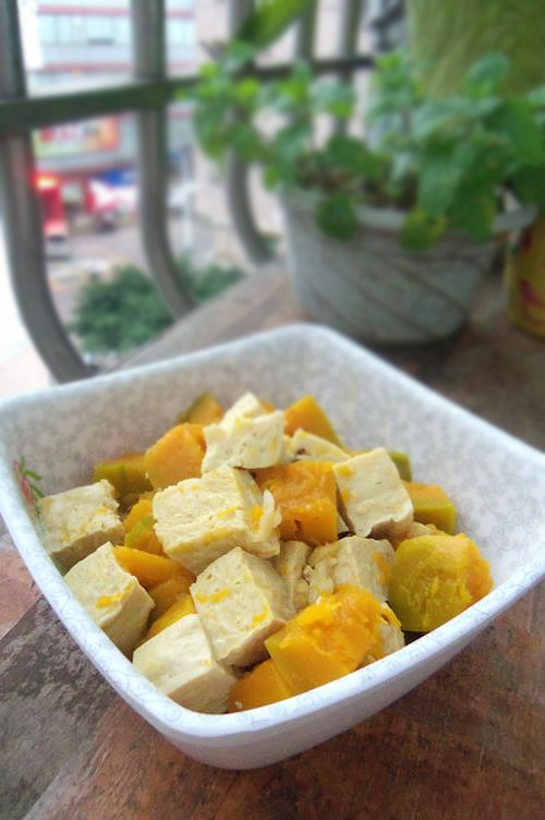 及以下步骤:原料图。 南瓜去皮去瓤洗净切丁,蒜切末。 原料图。 南瓜去皮去瓤洗净切丁,蒜切末。 原料图。 南瓜去皮去瓤洗净切丁,蒜切末。 起油锅爆香蒜末后放南瓜翻炒。 炒匀后下豆腐。 加入适量的水和盐,小心翻炒均匀。 中小火焖至南瓜软烂,豆腐入味即可。