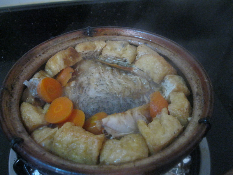 4、鱼腩摆进去,周围放上切开两半的油豆腐和胡萝卜