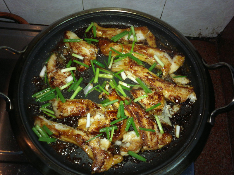 3、感觉差不多的时候,翻转一边再煎。煎鱼腩一定要小火,约五分一的火力。