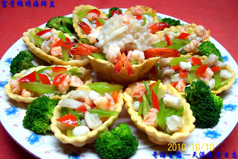 《富贵锦绣海鲜盏》---家宴花色造型海鲜类菜肴 《富贵锦绣海鲜盏》的命名: 是根据,鲜美的食材滋味和丰富的食材、缤纷的色彩、菜式成品形意而命名。 烹饪方法简介: 1、将制作在模具内的鸡蛋和淀粉炸制成金黄色,然后码盘不用; 2、将加工好的目鱼、虾、芹菜、花椒过水冷却后沥干水分不用; 3、锅淋油葱姜煸香,加入食材、高汤、盐、胡椒粉和适量清水,用大火烧开调味勾芡,然后,分装盘内即可。 菜式特点: 1、可作为高档家宴花色造型海鲜类菜肴,菜名祥和; 2、《富贵锦绣海鲜盏》菜肴,形式人性化、卫生,色彩鲜艳,形象逼真喜庆,芹菜、西兰花碧绿生青,花椒凤尾色彩喜庆,食材淡雅鲜美,清淡爽口与香脆可**融,口感丰富而独特,营养均衡。 现将《富贵锦绣海鲜盏》食材配置图解上传与亲们分享,希望能为亲们家宴增添一丝新意! 愿:美食常伴左右,人人福寿安康!
