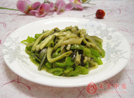 3、3、将青椒丝放入加少许盐煸炒一会儿,加入茄丝炒匀。