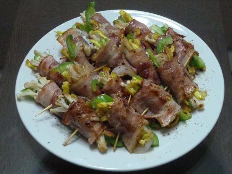 及以下步骤:原料很简单,青椒,洋葱,培根,金针菇还有两个鸡蛋。也可以换成其他的,喜欢吃什么蔬菜就多准备几样。 青椒、洋葱切丝,金针菇洗净。鸡蛋煎成鸡蛋饼,晾凉后切成鸡蛋丝。培根取出后从中间切开。 原料很简单,青椒,洋葱,培根,金针菇还有两个鸡蛋。也可以换成其他的,喜欢吃什么蔬菜就多准备几样。 青椒、洋葱切丝,金针菇洗净。鸡蛋煎成鸡蛋饼,晾凉后切成鸡蛋丝。培根取出后从中间切开。 原料很简单,青椒,洋葱,培根,金针菇还有两个鸡蛋。也可以换成其他的,喜欢吃什么蔬菜就多准备几样。 青椒、洋葱切丝,金针菇洗净。鸡蛋煎成鸡蛋饼,晾凉后切成鸡蛋丝。培根取出后从中间切开。 取出一片培根,在上面放上切好的食材,然后卷成卷,中间用牙签穿住。 卷好后的半成品就是这样滴。一般一袋培根是九片,中间对半切开后就是十八片。所以量还是挺多滴。 平底锅烧热,加少许油,因为培根上面也有肥肉,所以不必太多。油开后改小火,将培根卷放入煎熟,基本上五分钟左右即可。之后拣入盘中。 最后撒上黑胡椒粉末。由于培根本来就是咸的,所以就不需要加盐的。当然口重的话,也可以撒些盐面。来个特写,是不是很诱人那?