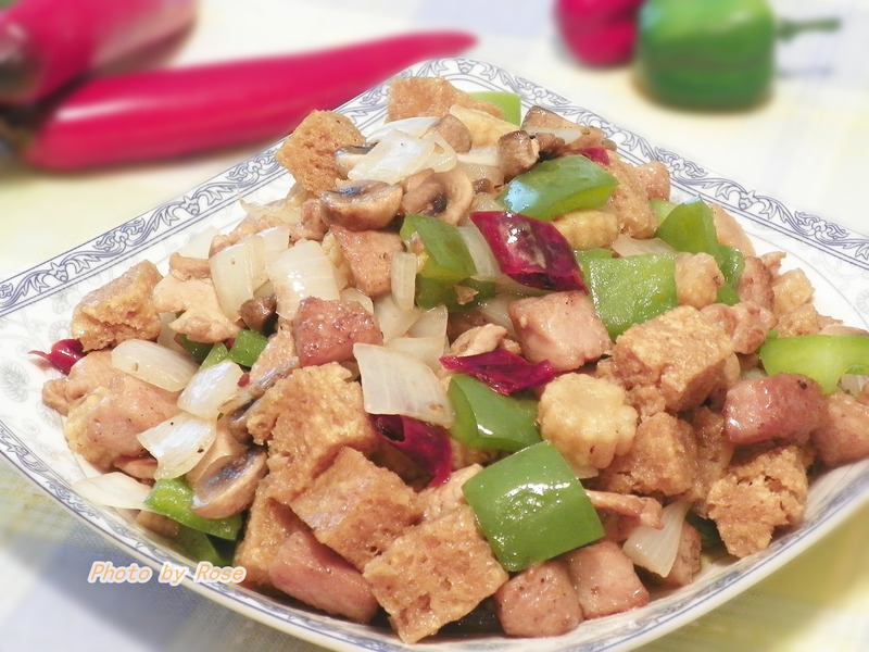 及以下步骤:起锅,先不要开大火,小火放辣椒段,也可再放些姜葱蒜,慢火将辣椒逼出味; 再放用生抽3茶匙、糖1/2茶匙、酒1茶匙、玉米淀粉1茶匙、蠔油1汤匙、麻油1茶匙和水小半碗兑成的碗汁(是整碗碗汁放入锅,不是在锅用调配),开大火,用勺不断搅拌,烧至碗全面起大泡; 倒入所有材料,翻匀即可上碟。 炸过豆腐的锅放入洋葱和菜椒过一过油; 蘑菇焯水,水放1茶匙盐和1汤匙油,让蘑菇有点底味和光滑些,水开时放蘑菇,用笊篱翻两翻立即捞起; 将鸡肉和猪肉三至四成热锅滑炒刚熟; 不用洗锅,再放蘑菇和玉米芯稍炒,盛起备用; 起锅,先不要开大火,小火放辣椒段,也可再放些姜葱蒜,慢火将辣椒逼出味; 再放用生抽3茶匙、糖1/2茶匙、酒1茶匙、玉米淀粉1茶匙、蠔油1汤匙、麻油1茶匙和水小半碗兑成的碗汁(是整碗碗汁放入锅,不是在锅用调配),开大火,用勺不断搅拌,烧至碗全面起大泡; 倒入所有材料,翻匀即可上碟。