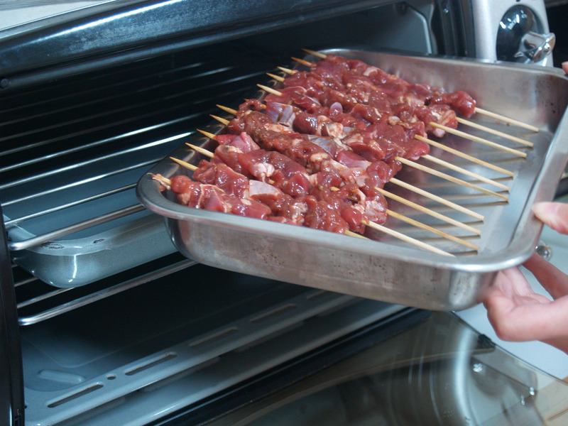 4、穿签好的肉串可以在烤箱中用180~200℃烤8~10分钟即可;或者可采用明火烧烤的方式,可以增加熏烤的香味