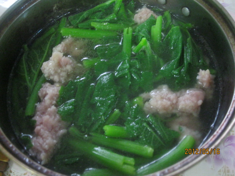 3、煮锅清水,水开后把肉膏分成一个个丸子放进去,煮到丸子浮起来时,放瓜苗进去,煮开三两分钟,放盐调味就可以了