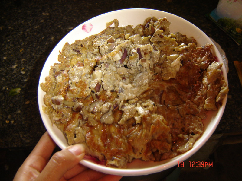 及以下步骤:倒入茄子丁,炒一下加一点盐,炒熟。(因为前面蛋里加了盐和耗油,所以茄子里要少放一点盐哦。) 炒熟之后,将茄子丁装入原先准备好的鸭蛋里,搅匀。 锅内再加入适量的油(油还是要多一点哦) 将搅拌均匀的茄子跟蛋一起下入锅内,用中小火慢慢煎哦。 等到两面煎的金黄了就可以出锅啦。我不会颠锅,所以煎得烂烂的,呵呵。 哈哈,不好看吧 锅内再加入适量的油(油还是要多一点哦) 将搅拌均匀的茄子跟蛋一起下入锅内,用中小火慢慢煎哦。 等到两面煎的金黄了就可以出锅啦。我不会颠锅,所以煎得烂烂的,呵呵。 哈哈,不好看吧