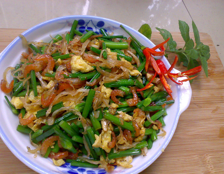 韭菜花(适量) / 蛋(1个) / 银鱼干(适量) / 小虾干(适量)