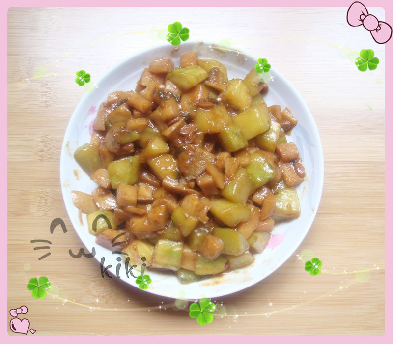5、再加入黄瓜丁一起煸炒至均占满酱汁。加入少许鸡精调味即可。