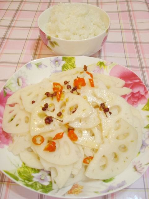 及以下步骤:原料:莲藕、清水、葱姜、花椒、红椒、盐香油、白醋、鸡精 藕削皮切薄片(越薄越好),放入滴有白醋凉水中浸泡几分钟捞起浸泡沥干水分 原料:莲藕、清水、葱姜、花椒、红椒、盐香油、白醋、鸡精 藕削皮切薄片(越薄越好),放入滴有白醋凉水中浸泡几分钟捞起浸泡沥干水分 原料:莲藕、清水、葱姜、花椒、红椒、盐香油、白醋、鸡精 藕削皮切薄片(越薄越好),放入滴有白醋凉水中浸泡几分钟捞起浸泡沥干水分 葱姜切丝,辣椒切成圈 锅里加香油烧7成热,加花椒葱姜丝干红辣椒爆香 锅里加香油烧7成热,加花椒葱姜丝干红撒上辣椒圈装盘,快炒不到2分钟辣椒爆香 麻辣爽脆