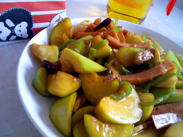 及以下步骤:长瓜。还记得吧,长得像辣椒的这货。 长瓜削皮切滚到块,肉切片,培根切粗条。青椒切丝。 长瓜。还记得吧,长得像辣椒的这货。 长瓜削皮切滚到块,肉切片,培根切粗条。青椒切丝。 长瓜。还记得吧,长得像辣椒的这货。 长瓜削皮切滚到块,肉切片,培根切粗条。青椒切丝。 长瓜。还记得吧,长得像辣椒的这货。 长瓜削皮切滚到块,肉切片,培根切粗条。青椒切丝。 锅中留油,爆香干辣椒和葱花,放入肉、培根,调入料酒炒匀。等肉变色后放入长瓜块,中小火不停翻炒,得炒个五分钟长瓜才能变软。然后下入生抽、蚝油炒匀。 改大火,加入青椒丝翻炒几下出味,然后调入鸡汁提鲜。这时候可以尝尝咸淡了,不够咸就再加点盐。不要多了,蚝油的味道很重的。