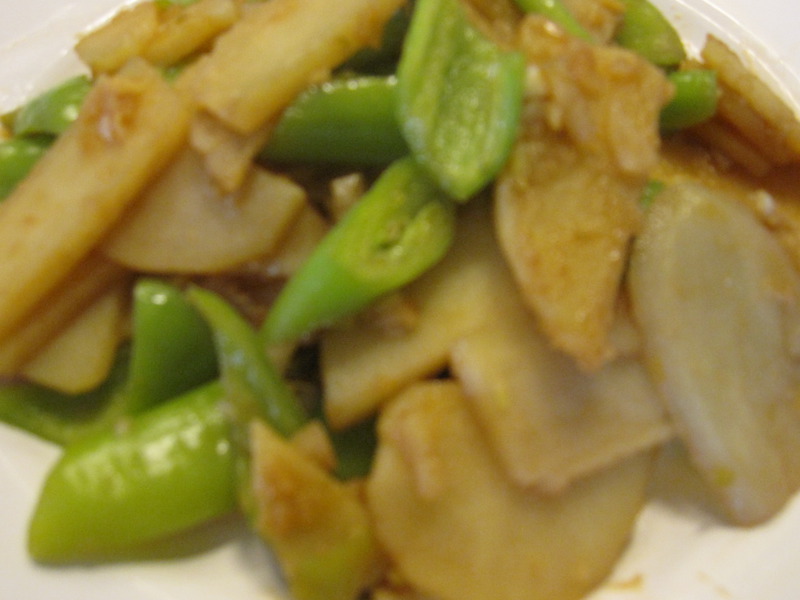 及以下步骤:水将收干时放入青椒片翻炒。 放盐、鸡精和少许糖,出锅前加入另一半的蒜末炒香。 蒜末分两次放,使土豆片出锅时有特殊的菜香。 土豆冲洗干净,控净多余的水。 热锅冷油,爆香葱姜,放一半的蒜煸至金黄。放入土豆片翻炒。 加入酱油炒匀。 因为土豆片较厚,只拿油炒不易熟透,这时加少许热水煎煮片刻。 水将收干时放入青椒片翻炒。 放盐、鸡精和少许糖,出锅前加入另一半的蒜末炒香。 蒜末分两次放,使土豆片出锅时有特殊的菜香。