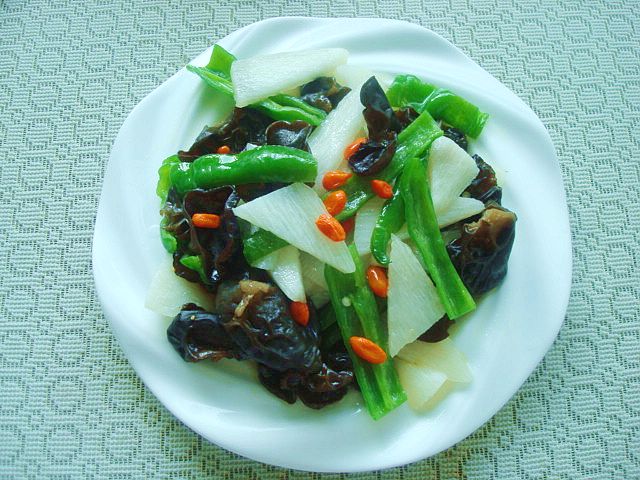 2、枸杞泡软洗清;黑木耳用热水泡软后洗净,剪去根部撕成小朵;青椒洗净切成片