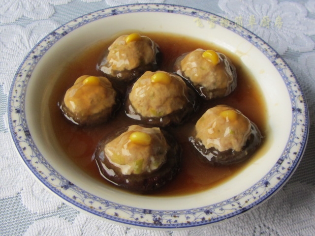 及以下步骤:填上鲜肉泥 全填好是六个,每个加一颗玉米粒点缀 上蒸锅大火蒸5-6分钟关火焖着 炒锅倒入香菇水,留底脚不用 煮开加入食盐少许,白糖一茶匙,加水淀粉滚一下,成玻璃糊 将玻璃糊用勺子加到每一个香菇盏上皆可端出 上蒸锅大火蒸5-6分钟关火焖着 炒锅倒入香菇水,留底脚不用 煮开加入食盐少许,白糖一茶匙,加水淀粉滚一下,成玻璃糊 将玻璃糊用勺子加到每一个香菇盏上皆可端出