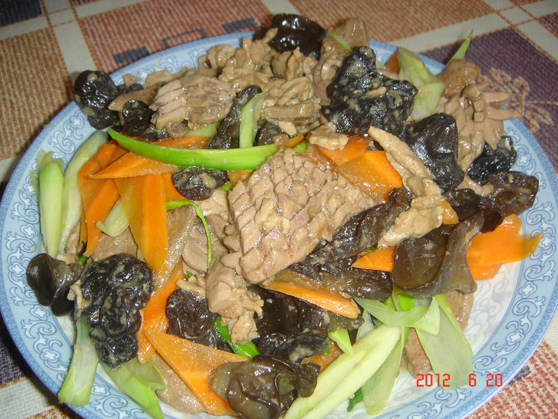 料酒(两汤勺) / 糖(5克) / 酱油(两汤勺) / 胡萝卜(50克) / 食用油(250克实耗50克) / 醋(半汤勺) / 青蒜(50克) / 黑木耳(10克) / 葱姜蒜(适量) / 花椒油(10克)