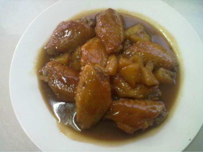 及以下步骤:倒入鸡翅翻炒一下,让糖色裹住鸡翅~~ 倒入清水,黄酒,放盐,倒点生抽调下颜色~~ 待汤汁收尽即可出锅装盘~~~~汤汁非常的浓稠~ 先盛盘子里 在煎鸡翅的余油里放入白糖,不断翻炒以免粘锅,这个过程就是炒糖色~~ 倒入苹果炸一下,也要不停翻炒,直至变黄~~ 土豆炸成外皮金黄色,脆脆的~~ 倒入鸡翅翻炒一下,让糖色裹住鸡翅~~ 倒入清水,黄酒,放盐,倒点生抽调下颜色~~ 待汤汁收尽即可出锅装盘~~~~汤汁非常的浓稠~