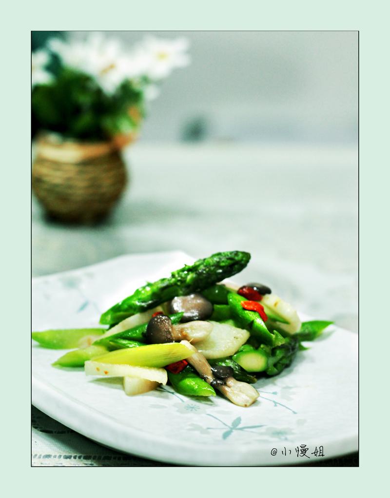 及以下步骤:热锅放入鸡油,烧至4成热,把食材一起放入锅中爆炒,放入盐和味精 选择新鲜的食材 把山药切成薄片 选择新鲜的食材 把山药切成薄片 入开水中焯一下 焯完的山药立即放入冷水中,以保持其清脆的口感 芦笋切去老皮后切成段 姬姬冼净备用 热锅放入鸡油,烧至4成热,把食材一起放入锅中爆炒,放入盐和味精