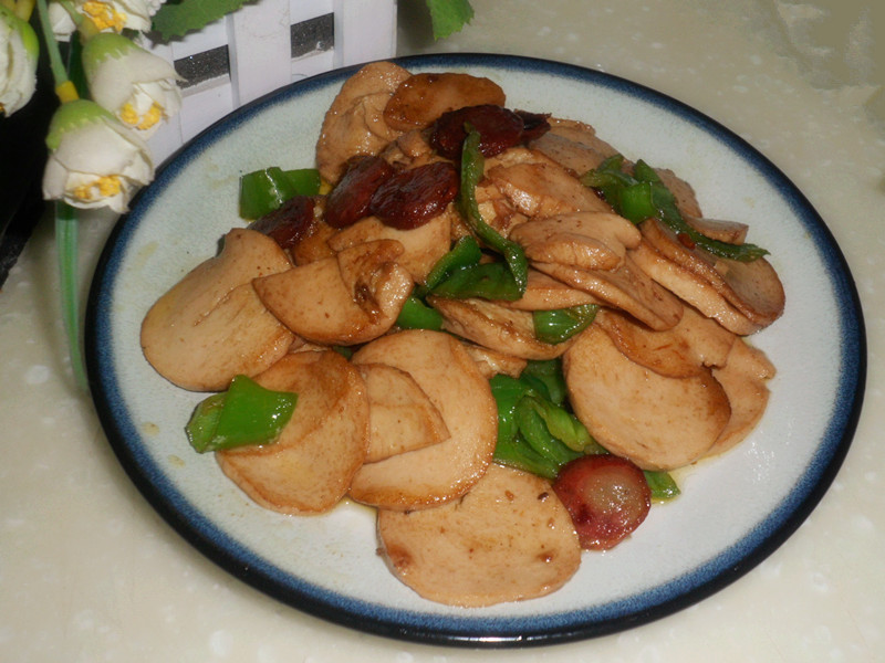 及以下步骤:热锅放油煎香肠 材料洗净待用 热锅放油煎香肠 材料洗净待用 热锅放油煎香肠 材料洗净待用 热锅放油煎香肠 放入料酒,豆瓣酱再煸炒会 到入清椒和素鸡煸炒 放盐,鸡精。再炒会,装盘!