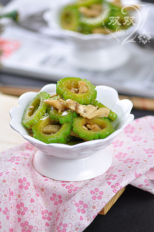 夏季气温增高,容易燥热上火,苦中带甜的美容佳品——苦瓜再次成为人们餐桌的宠儿。 苦瓜营养丰富,味甘苦性寒,具有清热解毒、滋肝养血、益气壮阳、清心明目、止立润肺、补脾胃的功效。素有天然胰岛素的美称,是很多人喜欢的美味佳肴。 懒刘同志最近上火,双双特意为其打造这款鸡丝炒苦瓜圈。 是不是看着图片挺有食欲?晶莹的汁水包裹,苦瓜滋润,肉丝滑嫩? 这里双双不得不说的,是水淀粉勾芡的的一点小作用。 看见苦瓜和鸡肉丝周身裹满的晶莹的汤汁了吗?这里面淀粉的作用可是不容小觑的呢! 一点点的水淀粉勾芡,能使菜色更加诱人,滋味更加浓郁,还特别上镜,有卖相!有兴趣的亲,炒菜的时候都可以添加一点试试哦!