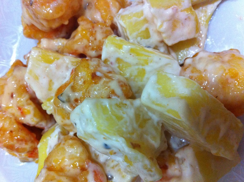 4、虾球稍微放置几分钟使温度下降,沙拉酱与千岛酱以1:1的比例调好,和炸好的虾球,菠萝拌匀即可