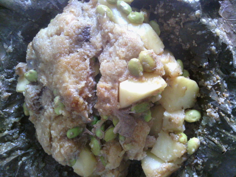 酱油(适量) / 生姜(适量) / 土豆(两个) / 花椒粉(少许) / 蒸肉米粉(适量) / 毛豆米(适量) / 干荷叶(一张)