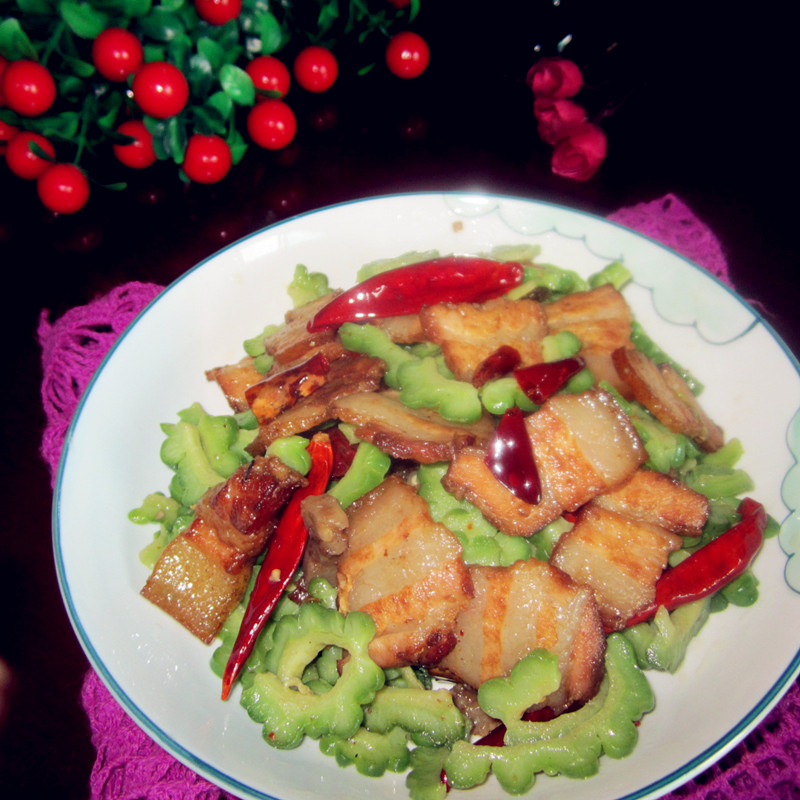 食材,腊肉半斤,盐,油,红辣椒数个,苦瓜1个,老抽, 自熏腊肉半斤,切片。 苦瓜1个从中间切两半,再切溥片。 锅烧油,放进干辣椒炒香,鲜红辣椒更好, 再放进处理好的苦瓜,加盐番炒。 再加入切好的腊肉翻炒,调入老抽,鸡精,出锅装盘。