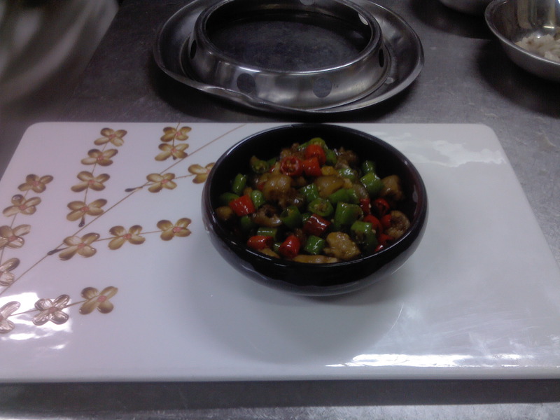 3、然后下小米椒,姜,香辣酱小量,再炒一下,下入青红椒,味精香油花椒油,