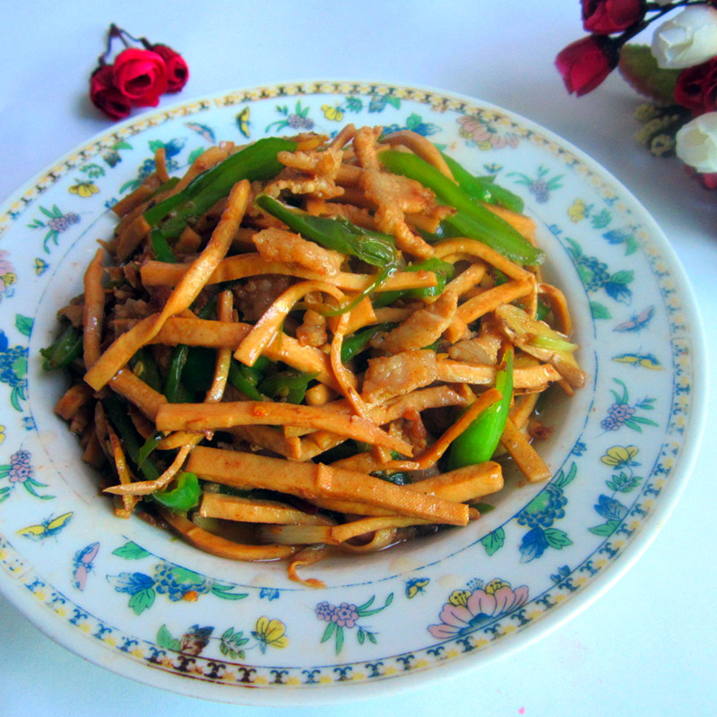 及以下步骤:炒干水分盛出装碗中待用 锅里再次放油,倒进切好的辣的辣椒,加盐翻炒 加入炒好的豆腐丝和肉丝 调入老抽 调入味精,耗油,调味鲜,炒均匀 出锅装盘 加入炒好的豆腐丝和肉丝 调入老抽 调入味精,耗油,调味鲜,炒均匀 出锅装盘