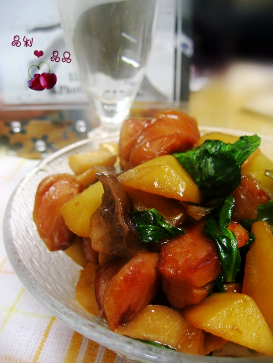及以下步骤:盛入盘中即可。 杏鲍菇洗净切小块,土豆去皮切小块,台湾香肠切滚刀小块,其他配料洗净切好。 炒锅内放入麻油,下台湾香肠,小火略煎。 杏鲍菇洗净切小块,土豆去皮切小块,台湾香肠切滚刀小块,其他配料洗净切好。 炒锅内放入麻油,下台湾香肠,小火略煎。 放入葱姜蒜,煸炒出香味。 加入土豆块、杏鲍菇块,中小火翻炒,使之沾到油。 依次加入味淋和酱油,翻炒均匀,再加1杯水,加盖略焖煮一会儿。 大火收汁,加入洗净的九层塔叶,关火,拌匀。 盛入盘中即可。