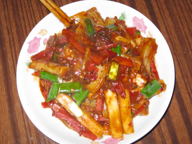 4、锅中倒入油,油热放入姜末炒香,放入切好的洋葱、胡萝卜、娃娃菜,翻炒一会加入辣椒酱加一碗水,水开后放入年糕,待水基本烧干后,出锅