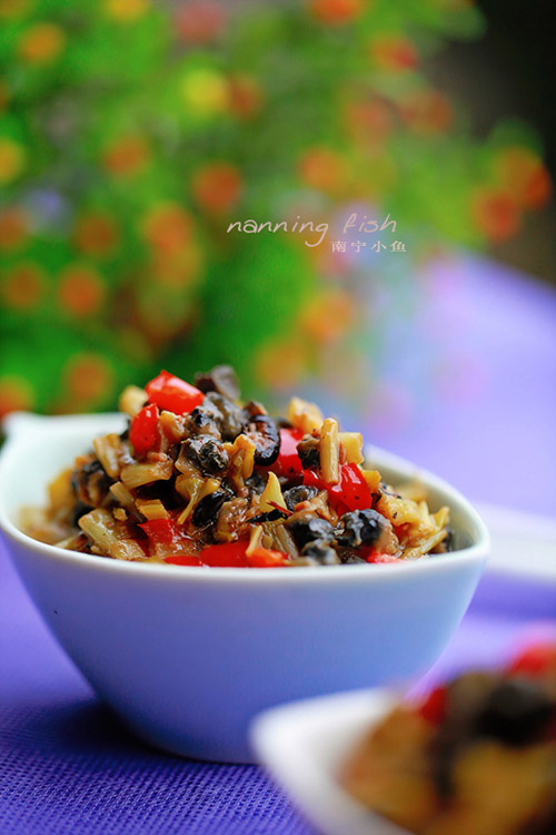 5、将炒锅刷净烧热,入豆鼓爆炒出香味加辣椒、姜末继续煸香