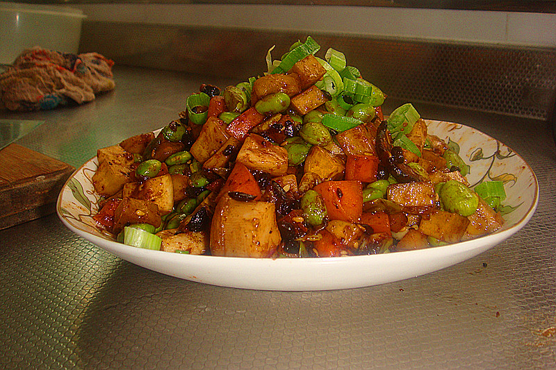 及以下步骤:撒上葱花,开吃啊 豆干和胡萝卜切丁备用 毛豆焯水备用 豆干和胡萝卜切丁备用 毛豆焯水备用 杏鲍菇切丁后微波炉高火三分钟备用。 锅中倒油后下入胡萝卜和豆干 把胡萝卜炒上2分钟后下入一大勺蚝油和一大勺豆豉香菇酱翻炒均匀。 这时放入毛豆和杏鲍菇翻炒一分钟加盐和鸡精调味 撒上葱花,开吃啊